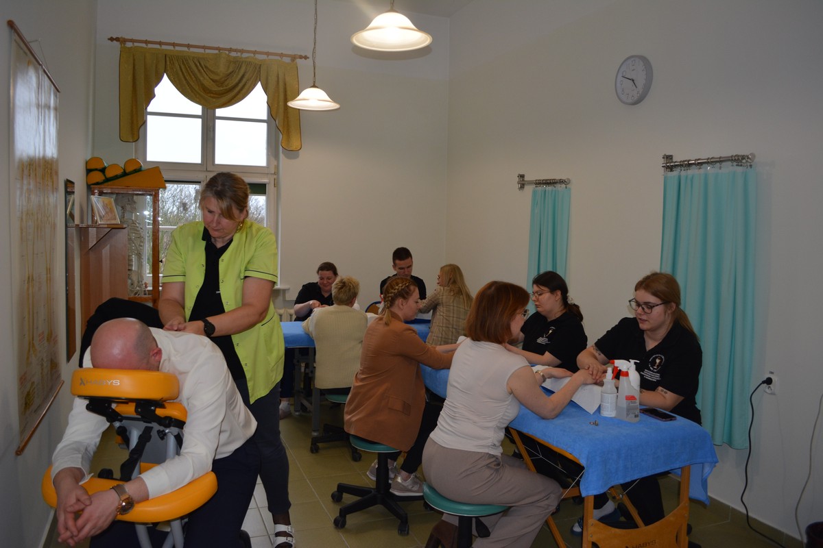 Nie zabrakło także chwili relaksu i zadbania o dobre samopoczucie. Uczestnicy mogli skorzystać z masażu biurowego oraz masażu dłoni, przygotowanego przez słuchaczy pod opieką Barbary Ruczkowskiej. Dużym zainteresowaniem cieszyła się również analiza kolorystyczna przeprowadzona przez Izabelę Gucwę-Wojtkowiak, która dostarczyła wielu ciekawych wskazówek dotyczących wizerunku i doboru kolorów.