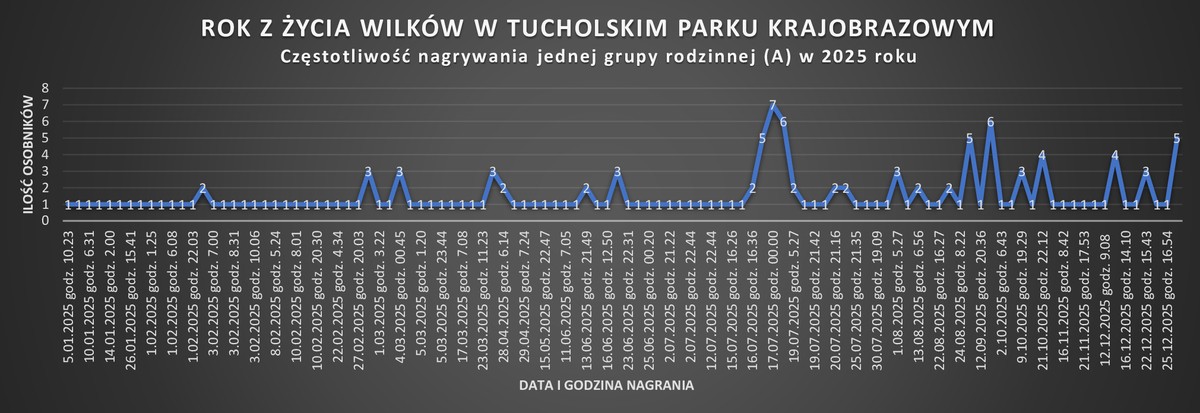 Rok 2025 potwierdził stabilność populacji wilków w Tucholskim Parku Krajobrazowym, utrwaloną obecność czterech grup rodzinnych oraz skuteczność prowadzonego monitoringu. Obserwacje nowo zidentyfikowanej grupy D oraz rejestracja szczeniąt w grupie A podkreślają znaczenie systematycznego monitoringu i dokumentowania dynamiki populacji. Jednocześnie prowadzony monitoring, w połączeniu z działaniami edukacyjnymi w regionie, pomaga ograniczać konflikty między wilkami a ludźmi i wspiera akceptację gatunku wśród mieszkańców.