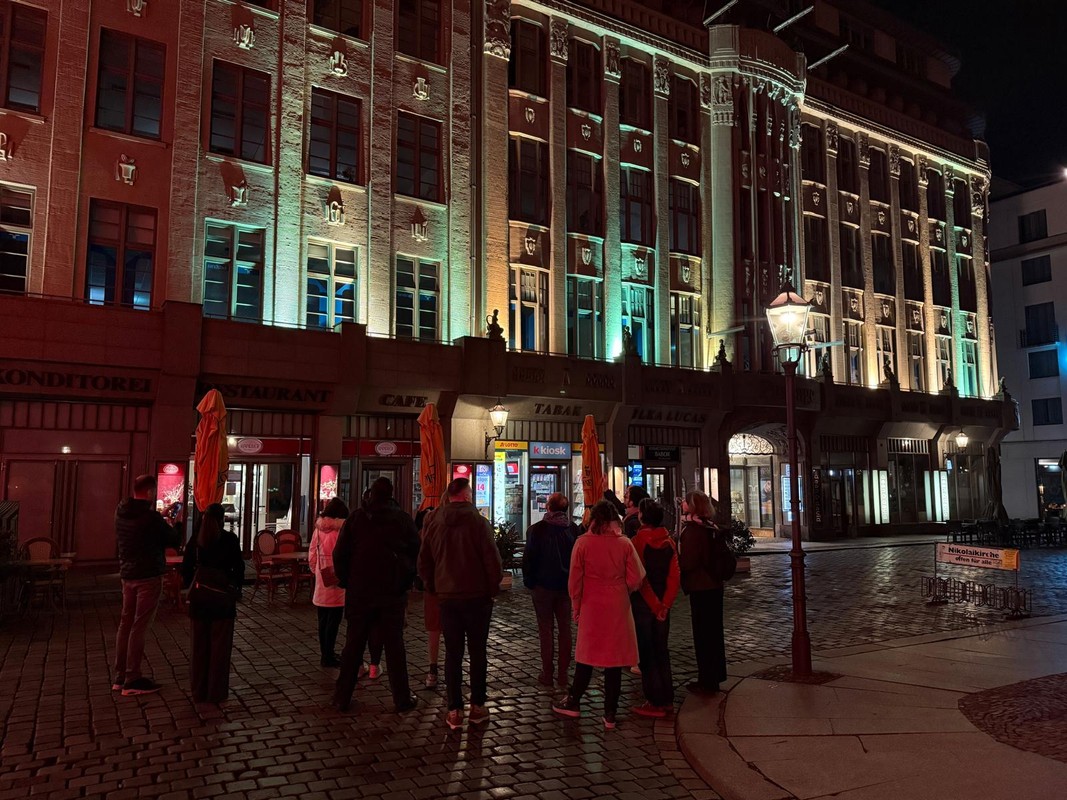 Uczestnicy spotkania w Lipsku mieli również okazję wziąć udział w nocnym spacerze studyjnym, podczas którego analizowano dobre i złe praktyki w zakresie oświetlenia miejskiego. Szczególną uwagę zwracano na iluminację budynków i zabytków – wskazując, jak odpowiednio zaprojektowane oświetlenie może podkreślać walory architektoniczne, jednocześnie nie przyczyniając się do nadmiernej emisji światła w górę i jego negatywnego wpływu na środowisko.